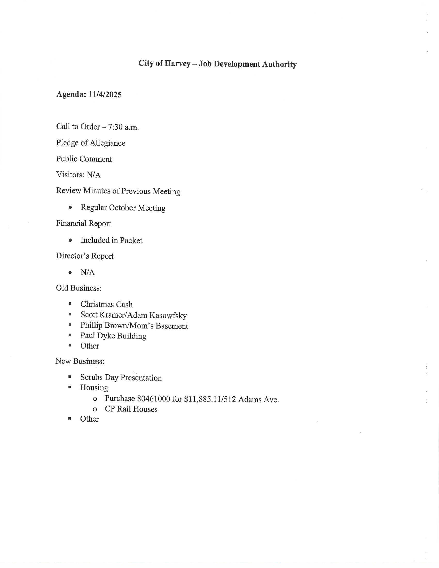 Scott Kramer with Blue Cube Partners Housing LLC was there to present the Board with a proposal to develop the properties in the ballpark addition of the City of Harvey. After much discussion, the Board decided to revisit the proposal at the next JDA meeting after gathering some additional information. Mr. Kramer will also need to present the City Council with a plan/bid for the properties.